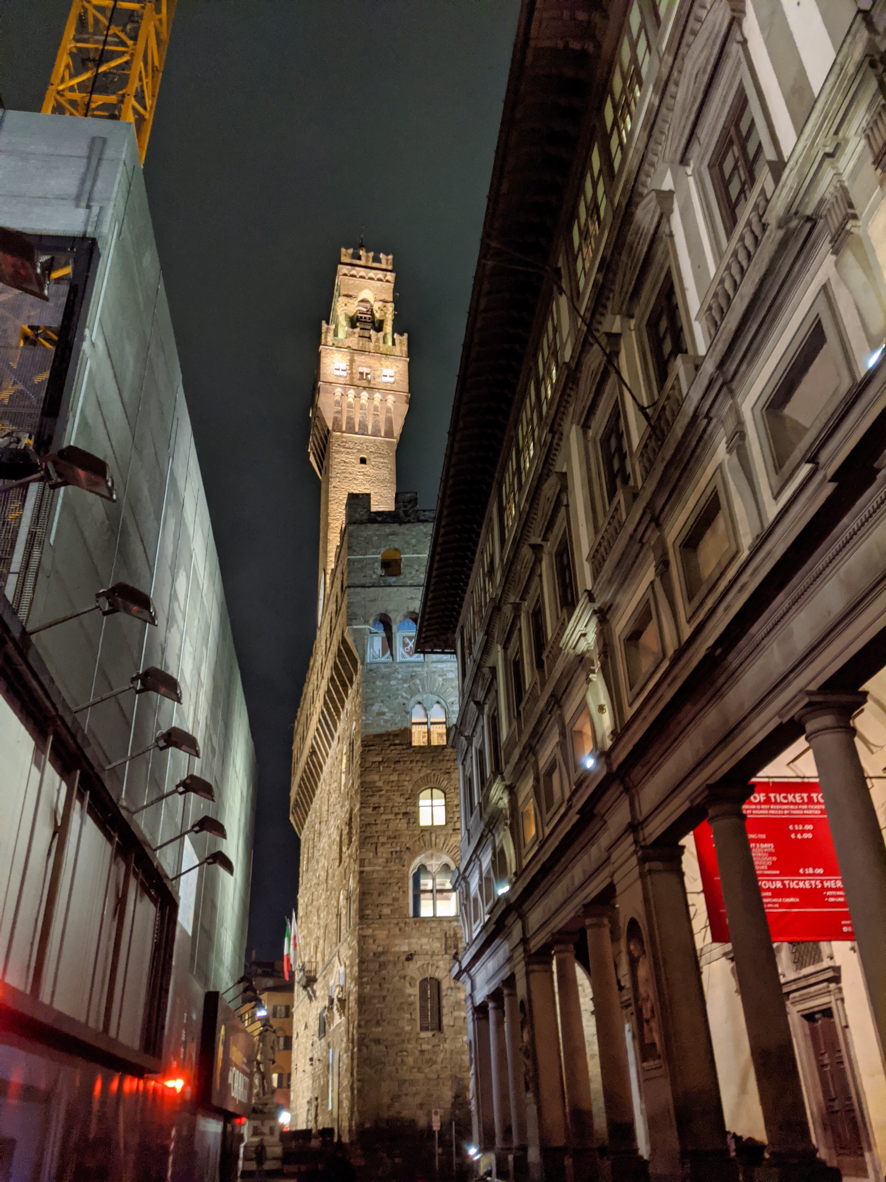 The Palazzo Vecchio is the town hall of Florence, Italy. It overlooks the Piazza della Signoria, which holds a copy of Michelangelo's David statue. It's one of our favorite chill spots, and it has a handful of great spots in the courtyard for al fresco dining.